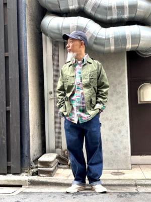 日中は暖かい日が増えてきました。東京は桜の開花宣言も出て、春本番です。お天気が安定しませんが、明るい気分で参りましょう。早速スタイリング。近年では、すっかりファッションアイテムとして市民権を得たジャングルファティーグジャケットが主役。ミリタリー系の復刻に定評のある「BUZZRICKSON'S」から。もともとは過酷なジャングルでの着用を考慮して開発されたジャケットで、ハリ・コシのあるコットンポプリン製。フロントの4つのマチ付きポケットが特徴的ですね。サラッとした質感で、春先から初夏にかけての羽織物にピッタリです。インナーには綺麗な配色の、「CAMCO」マドラスパッチワークシャツ。アウターの無骨さをシャツで中和しています。「SMITH'S」のペインターパンツのデニムブルーも、青味が強くて爽やかです。「AMERICAN NEEDLE」のキャップは、一番人気のクマ柄。春が近づくと、淡い色合いや明るい色合いを着たくなりますね。是非。
