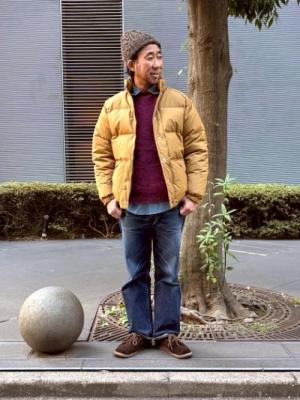 あっという間に12月。冬物をガンガン楽しんでいきましょう。スタイルに参ります。街には中綿系のアウターを着ている人もチラホラ。CAMCOのダウンジャケットは程よいボリュームで着やすいですよ。デットストックの60/40の生地が魅力的です。インナーにはPETER BLANCEの綺麗な色のシャギーセーターを。シャツはいつものB.Dではなく、BAGGYの丸襟にすると雰囲気が変わって◎皆さんも冬スタイル楽しんでくださいね!