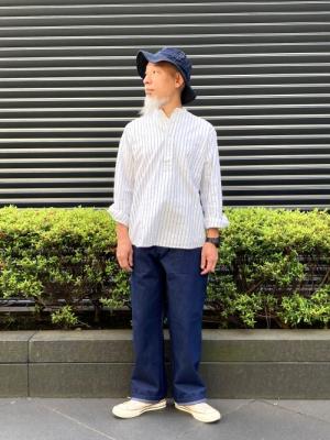 ゴールデンウィークの連休、お仕事だった方もお休みだった方も、お疲れさまでした。夏本番前の、ひと山越えた感がありますね。ちょっと肩の力を抜いてリラックスしませんか。そんな感じでスタイリングです。日中はシャツ一枚で気持ちの良い季節。「BAGGY」のバンドカラーシャツがおススメです。目を惹くプルオーバー仕様と、低めな設定のバンドカラーの襟元がポイント。サラッと質感の、シャンブレー織のストライプ柄も、初夏の陽射しに映えてます。洗いざらしをザックリと着てください。シャツが個性派なので、ボトムはシンプルに。追加分も入荷した「GUNG HO」のファティーグパンツから、デニム生地を合わせました。程よいゆとりのあるシルエットが、全体のリラックス感をより演出してくれてます。足元はキャンバススニーカーで。もっと暑くなったら、素足にサンダルでも良さそうです。ハットもデニムで色数も少なくまとめましょう。こちらはお馴染み「BUZZRICKSON'S」です。シンプルにまとめた初夏のリラックス・スタイル。皆様も是非。