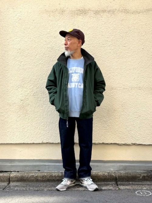 11月も終盤。週明けからは12月とは、今年も早いですね。駆け込み冬支度の方々に、連日ご来店いただき有難うございます。今週もおススメをスタイリングです。いかにもリアルアメリカンなアウターは、ニューヨークの「GAME SPORTSWEAR」から。フリースの裏地付きのナイロンブルゾンです。スポーツウェアのみならず、消防や警察のユニフォームも手掛ける同社ならではのシンプルで実用的なジャケットです。ゆったりシルエットで重ね着もしやすいですね。少し“いなたい”感じがGOOD。インナーには「MIXTA」のクルースウェットを。綺麗なサックスブルーに白のフロッキープリントがビンテージ感ある仕上がり。この辺のセンスが流石です。ボトムはシンプルに「CAMCO」のデニム5ポケット。冬は濃い濃いのブルーデニムが雰囲気です。別注した「COOPERSTOWN」のコーデュロイキャップも調子良いですよ。スポーツ由来のアイテムを中心とした、冬のアメカジスタイルです。いかがでしょう。