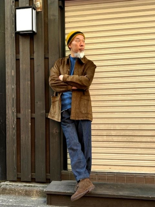 お天気に恵まれて、気持ちの良い日が続いてます。ちょっとお散歩気分です。初冬の装いで、ふらっとお出掛けでもいかがでしょう。早速スタイリング。「LE TRAVAILLEUR GALLICE」のコーデュロイ・カバーオールが、昨年に引き続き人気です。コットン×リネンの珍しいコーデュロイ生地が、程よい光沢感で大人の雰囲気。本場フレンチスタイルのワークアイテムは、アメリカ物とは一味違った雰囲気ですね。インナーには「PETER BLENCE」のシャギードッグセーターを合わせています。いつもながら素敵な発色。ふんわり軽くて暖かな仕上がりは、現地生産ならではで流石です。ボトムはお馴染みの「KINGSWOOD」のデニムトラウザー。穿き心地が良く、癖のないシルエットは様々なアイテムと着合わせのバランスがとりやすいので、ついついヘビーローテーションになってしまいます。「KEP'S」の素朴なデザートブーツとも好相性。「HIGHLAND2000」に別注したライン入りのニットキャップが、シンプルな着こなしのアクセントになっています。一つ一つのアイテムにはこだわりながらも、スッキリまとめた着合わせです。気軽な街ブラに是非。