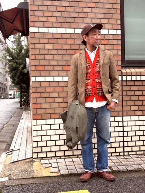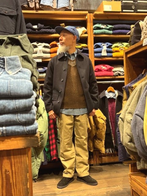 新年あけましておめでとうございます。今年も皆さんに楽しんでいただけるよう頑張ります!どうぞよろしくお願いいたします。本年一回目のスタイルは、冬&春折衷スタイルで参ります。寒さ本番はこれから、セーターは欠かせませんね。つい先日に入荷した新作のJAMIESON'Sのセーターは待ったかいのある逸品です。今回着たEVERESTは、パッと見た目は普通ですが、よ~く見るとちょっと違う、通好みな一着。是非チェックしてくださいね。上にはCAMCOのヘビーコットンツイルC.P.O.を。厚手のコットンシャツジャケットは、中身を変えて春も大活躍してくれます。コートはKINGS WOODのナイロンコートで軽やかに。ウィンドブレーカーみたいな感覚でとても着やすく、オンでもオフでも使えるので結構重宝しますよ。皆さんも色々な着合わせを楽しんでください!
