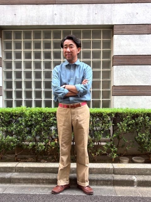 朝から30度越えはちょっとキツイですが、秋スタイル参ります!先週は色合い。今週は生地あいです。この時期はまだ薄手の生地あいのシャツが着やすいですよね。リネンコットン、マドラスはもちろんですが、このシャンブレーも着やすいですよ。中でもラウンドカラーは襟先が少しだけ跳ねる感じがちょっと小粋でおススメです。パンツはKINGSWOODのベーシックなチノパンを、いつもより一つ大きいサイズでゆったりと穿いて涼しく。アクセントのベルトは綺麗なナンタケットレッドのLEATHERMANを合わせてみました。皆さんも色々な着合わせを楽しんでください!
