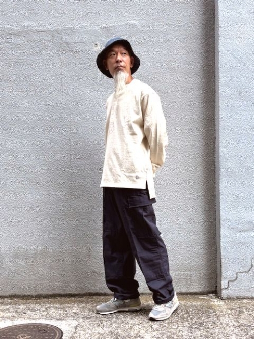 秋に向けて、シンプルながらも素材感やディテールに特徴のあるアイテムが届いています。早速スタイリング。フランスは「CONCHON QUINETTE」のヘンリーネック・カットソー。ドライな質感のオーガニックコットン素材が良いです。適度なハリ・コシがあり、一枚で着ていても型崩れしにくくラフになり過ぎない大人のカットソーです。裾のスリットも特徴的ですが、よく見ると袖口のリブも段編みになったビンテージ仕様。こういった細かなこだわりが、全体に良い空気感を与えてくれます。ボトムは「PROPPER」から6ポケットカーゴです。この手のミリタリーパンツとしては、スッキリめの美シルエット。サラッとした綿100%のリップストップ生地もGOODですね。ダークネイビーを選べば、土臭いミリタリーとは一味違った印象になりますね。アクセントにもなっているサイドの大きなカーゴポケットがポイントです。ウォッシュ加工で雰囲気のある「DORFMAN」のハットもハマってます。簡潔な着こなしの時ほど、素材やディテールに拘ってみてはいかがでしょう。