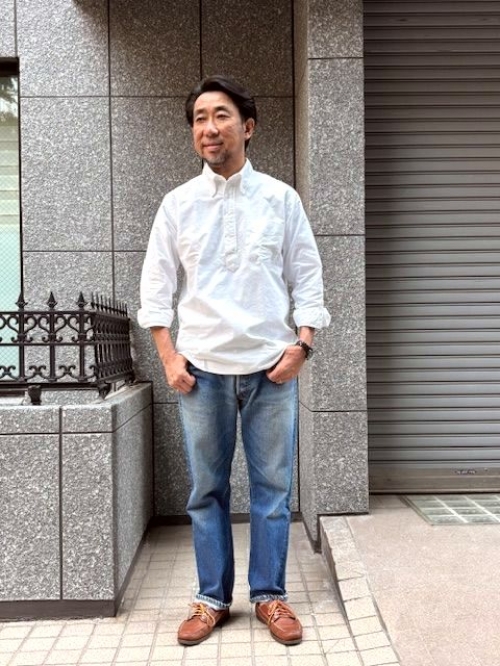 気が付けばもう9月。ちゃんと長袖、長パンでスタイルに参ります!シャツ一枚ですませるならやっぱりプルオーバーですね。BAGGYのオックスフォードプルオーバーは欠かせません。プルオーバーラバーの方々は、長袖に切り替えていきましょう(笑)パンツもデニムをそろそろと思いつつも、見た目の軽い薄色の501がまだ良いですね。足元もL.L.BEANのブラッチャーで、全体的に軽めにいかがでしょうか。