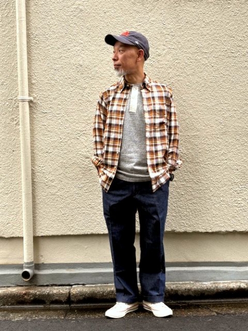 スッキリしないお天気が続いてます。これが抜ければ秋らしい陽気になるのかな?淡い期待を抱きつつ、秋色を意識してスタイリングです。ブラウン系の良柄がポイントの、「BAGGY」ツイルシャツが主役。これ一着で季節感を演出できちゃいますね。お馴染みのアメトラシルエットなので、適度にリラックスできて初秋に良さそうです。ソフトな着心地もGOOD。インナーには「BUZZRICKSON'S」の丁寧に作り込まれたヘンリーネックTEEを合わせました。一気にアメカジ感。ボトムは大人デニムな「KINGSWOOD」のトラウザー。いわゆるジーパンでないデニムパンツとして、毎シーズン人気です。ライトオンスのデニム生地なので、今時期からでも活躍してくれますよ。キャップはお待ちかねの「AMERICAN NEEDLE」。こちらも毎シーズンご好評いただいてます。入荷直後の今なら、柄も選べますよ。お早めに。秋の入り口、まずはシンプルにいかがでしょう。