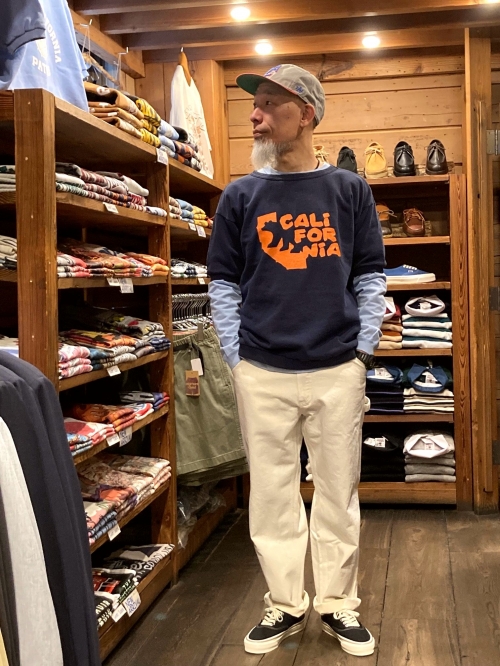 4月に入りましたね。春本番です。と、言いたいところですが今週は寒かったですね。週末からまた気温が上がりますので、期待しましょう。お馴染みの「MIXTA」から、お待ちかねの半袖スウェットが到着。早速スタイリングです。今シーズンも良柄ぞろい。本日は、ネイビーボディにオレンジのプリントが目を惹くCALIFORNIA柄。ビンテージディーラーでもあるデザイナーが手掛けるブランドなので、小さめな袖や広めなネック周りなどOLD感のあるディテールにもご注目くださいね。インナーには「MAYO SPRUCE」の長袖TEEを合わせています。9.72ozの厚手な生地は、暖かくなってきたらカットソー感覚で着るのにもピッタリですよ。ボトムは春らしく白パンで、「SMITH'S」の新作ペインター。1975年発行の“MADE IN USA CATALOG”にも掲載されていたモデルの復刻です。ライトオンスの生地なので、夏にかけては素足にサンダルで~なんて着合わせにも使えそう。今回は足元もカリフォルニアらしく「VANS」で。キャップは「AMERICAN NEEDLE」の新作から“LA”柄を合わせました。やはり暖かくなってくると明るい色合いが着たくなりますね。是非。