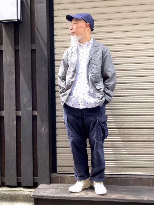 日中は、すっかり初夏の陽気で半袖で過ごすことも増えてきましたが、朝晩はまだまだ半袖では心許ないですね。薄手の羽織が重宝してます。早速スタイリング。お馴染みの「CAMCO」3ボタンジャケットに、新素材が仲間入り。薄手で軽量ですが、しっかりと目の詰まった織りでハリ・コシが特徴的なタイプライター生地。サラッと質感なのも嬉しいですね。縫製部分には洗いの加工でパッカリングも浮かんでいて、表情豊かな仕上がりになっています。今時期はもちろん、本格的な夏になっても冷房対策に良さそうです。インナーには、今年も無事に入荷した「SUN SURF」のプリントオックスフォードシャツ。ヤシの木とフラダンサーの総柄で夏気分。すっかりアジの出たパンツは「PROPPER」。こちらも薄手ながらしっかりとした質感が好評ですね。近年珍しくなった綿100%のミリタリーパンツは、ガシガシ洗って風合いが出たくらいからが本番です。キャップは英国「AU VRAI CHIC BRITAIN」のアイリッシュ・リネン物。こちらも毎年人気ですね。ばっちり入荷してます。季節感のある素材で楽しむ初夏のジャケットスタイル、いかがでしょう。