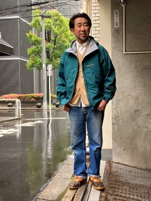 ジメジメの梅雨が近づいてきましたね。雨でも楽しくなるスタイルで過ごしましょう。今週も参ります。中に着るのはサラッとしたBAGGYのリネンコットンのシャツが気持ちいいですね。もう半袖を着てみましたが、雨除けのアウターを脱いだらちょっと心許ないのでCAMCOのハンティングベストを上に着てみました。ベストって結構便利なんですよね。雨除けはL.L.BEANのPERTEXジャケットを。防風防水でブレサブル。梅雨時の強い味方です。さぁ、お出掛けしましょう!