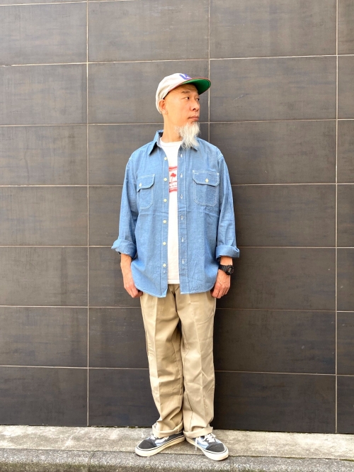 5月って、こんなに暑かったですかね?? な会話が飛び交った今週は、サラッとシンプルな着こなしがピッタリでした。早速スタイリング。上着感覚でざっくりと羽織っているのは、お馴染み「CAMCO」のシャンブレーワークシャツ。新色のネイビーもご好評いただいておりますが、定番のブルーもやはり良いですね。ドライな質感なので、この時期でもベタつかずに快適な着心地。汗をかいてもガシガシ洗えますし、ワークアイテムらしく少々手荒に扱ってもOKなので、気兼ねなく着まわせて便利です。インナーには、カリフォルニアの「SLOPPY SUPPLY」のプリントTEE。現地の企業系パロディが得意なブランドですが、この柄はまんま人気ハンバーガーチェーンのそれに見えますね。久しぶりに食べたくなりました。パンツは、リアル・アメリカンワークな「RED KAP」。近年珍しい100%コットンのワークチノを製造する数少ないブランドです。個人的には、ワークパンツはポリコンよりも綿100%派。キャップは「AMERICAN NEEDLE」の新作から“LA”柄です。梅雨入り前からこの湿度は反則ですよね。少しでも気分の上がる着こなしで、気持ちよく過ごしましょう。