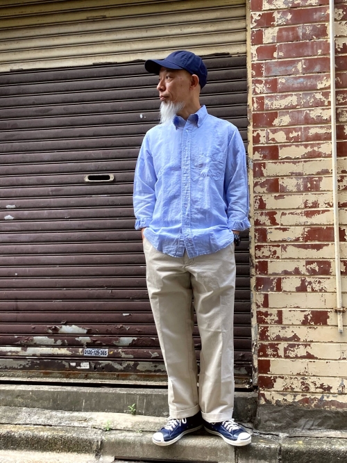 日によって寒暖差が激しく、湿度によっては数字上の気温と体感温度の差で不快だったりと、春から夏の変わり目は着るものに悩まされますね。サラッと快適で、それぞれの素材ならではの質感を活かした、シンプルながらも存在感の出る着こなしがおススメです。早速スタイリング。すっかりお馴染みとなったリネン×コットン素材の「BAGGY」ボタンダウンシャツ。今時期は長袖が丁度良いですね。通気性はもちろん、速乾性にも優れているので、じめっとしていても肌触りはサラッとドライ。適度なハリ・コシと、表情豊かなシワ感で見た目にも主役級のポイントになってくれます。パンツは「KINGSWOOD」のチノトラウザーを。決して太くはありませんが、適度なゆとりのあるストレートシルエット。白っぽいストーンカラーが夏らしい一本です。日除けのキャップもシンプルに、「DORFMAN」の定番キャップ。単色無地キャップは、いくつあっても困りませんね。色違いで用意して、その日の気分で使い分けましょう。色数少なく、スッキリ爽やかにまとめたシンプルな着こなし。いかがでしょうか。