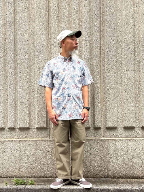 連日の25℃越え…夏です。まぁ初夏です。ぼちぼちALOHA系のプリントシャツも出番ですね。久しぶりに、ハワイは「REYN SPOONER」から新作が到着。早速スタイリングです。2023年のマウイ島の火災や、様々な要因で最近は入荷のなかった「REYN SPOONER」。復活入荷の第一弾は、毎年リリースされているアメリカ独立記念日モデル。コレクターもいる人気柄ですね。今年も良柄ですよ。ボタンダウンの襟型に、プルオーバー仕様の前立てがトラッドな雰囲気。リゾートし過ぎていなくて、街着としても取り入れやすいですね。当店でもファンの多いブランド。パンツは「GUNG HO」のファティーグ。リップストップ・コットンのモデルは、薄手ながらコシのある生地感がポイント。サラッとした肌触りで、夏場も活躍してくれそうです。往年のHEMPシリーズを彷彿とさせてくれる生地感が夏らしい「VANS」も雰囲気ですね。コスパ最強の「DORFMAN」キャップは2TONEカラーが爽やかでおススメです。夏本番も間近ですよ。準備を進めましょう。