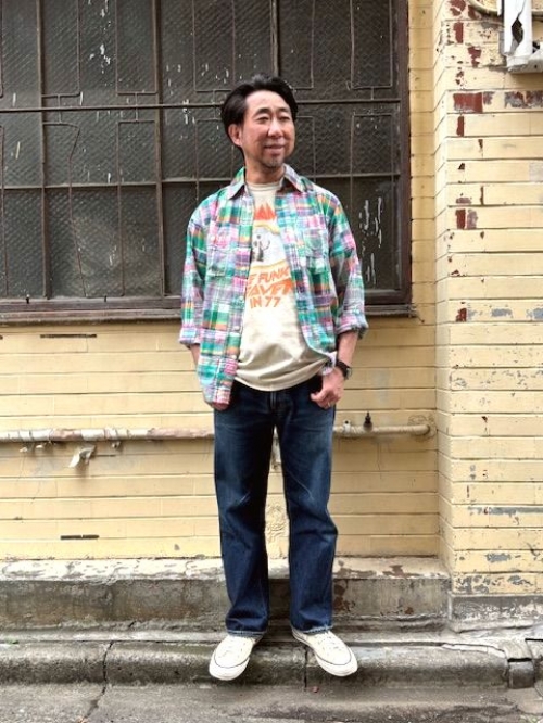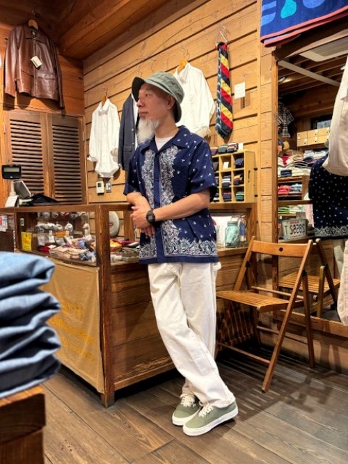 関東も梅雨入りでお天気が今一つですが、着るものくらいはメリハリ付けてみようかと…早速スタイリングです。ビンテージのバンダナがモチーフの、「SUGAR CANE」のプリントシャツが主役。パキッとした色使いが良いですね。鏡にチラッと映ってますが、背面も総柄です。オープンカラーでスクエア型のシルエット。浴衣のような薄手ながら張りのある生地感もGOODですね。インナーのTEEとパンツは潔くホワイトで。濃紺シャツとのコントラストを意識しました。ちなみに、TEEはアメリカ製でコスパが最強の「CAL CRU」。パンツは細部の作り込みまでこだわっている「SMITH'S」の1975モデルです。HEMPのような質感が夏らしいシューズは「VANS」。日除けにも小雨除けにも使えるハットは「DORFMAN」です。どんよりお天気が続きそうですが、ハッキリ・スッキリな着こなしでサッパリといきましょう。